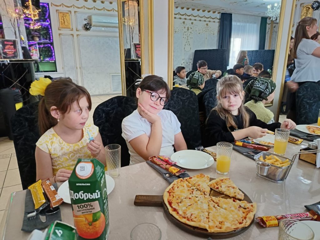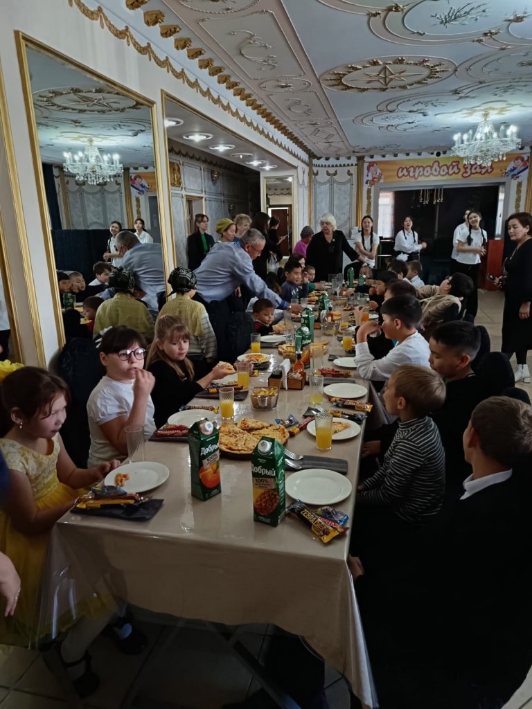«Мангал» кафесінің иелері ыстық түскі ас ұйымдастырды, онда балалар барлығына ұнайтын пицца, фри және наггетстерден дәм тата алды. Кафе иесі және «Азия» сауда үйінің жеке кәсіпкері Рахметова Динара Серікқызының тәттілері балаларға жылулық, күлікі мен қолдауға толы керемет күнді еске қалдырды.