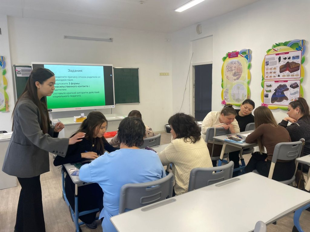 Отырыстың күн тәртібіне сәйкес «Әлеуметтік педагогтың әкімшілікпен, педагогтармен және ата-аналармен өзара іс-қимылы: «өзара іс-қимыл картасын» әзірлеу; ведомствоаралық ынтымақтастық бойынша кейстер (КТІ, КДПР, ҮЕҰ)» тақырыбында Атбасар қаласының № 2 ЖОББМ әлеуметтік педагогы Дана Маратқызы Темірбекова таныстырды. Шеберлік сыныбы барысында білім беру процесіне барлық қатысушылардың қызметін үйлестірудің практикалық құралдары көрсетіліп, балалардың құқықтары мен мүдделерін қорғауға бағытталған тиімді ведомствоаралық өзара іс-қимылдың нақты жағдайлары қаралды.
