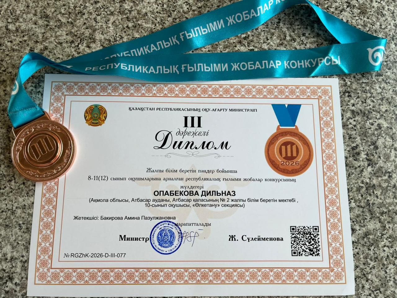 Бұл жетістік – оқушының табанды еңбегінің, мектеп ұжымы мен жетекші мұғалімдердің кәсіби қолдауының нәтижесі.