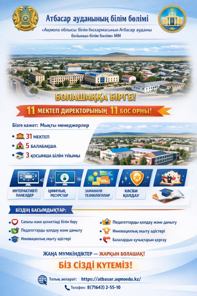 Толық ақпаратты білім бөлімінің ресми сайтынан https://atbasar.aqmoedu.kz/, сондай-ақ көрсетілген 8(71643)-2-55-10 телефоны бойынша кадрлар бөліміне хабарласуға болады